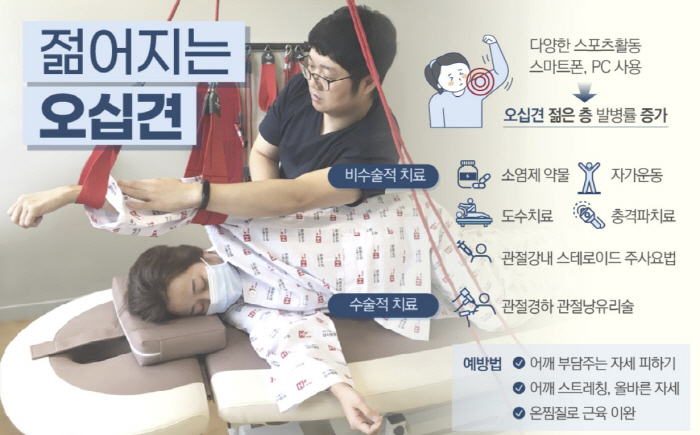 에이치플러스 양지병원 정형외과 이명근 전문의는 "오십견으로 최종 진단이 되면 치료는 먼저 비수술적 치료로 최소 6~8주간 시도하는데 보존적 치료는 소염제 약물, 자가운동과 도수치료가 있고 중증이면 관절강내 스테로이드 주사요법과 충격파치료를 대안으로 적용한다"고 설명했다.