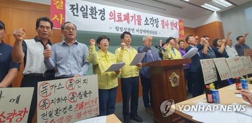 상관면 주민들과 윤수봉·권요안·오현숙 도의원은 이날 전북도의회에서 기자회견을 열고 "민간 환경업체가 2021년부터 하루 48t을 처리하는 의료폐기물 소각장을 건립하려고 하는데 건립 시 주민 건강을 해치는 것은 물론 주거환경 악화와 영농환경 훼손으로 이어질 것이 불을 보듯 뻔하다"고 주장했다.