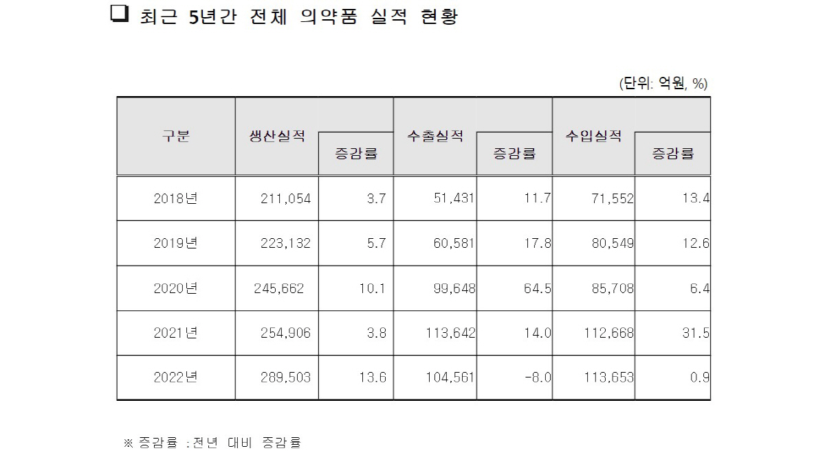 지난해 국내 의약품 생산실적은 28조9503억원으로 2021년보다 13.6% 증가했다. 최근 5년간 연평균 성장률은 8.2%로 같은 기간 국내 제조업 총생산 연평균 성장률(2.2%)의 4배 수준이다.