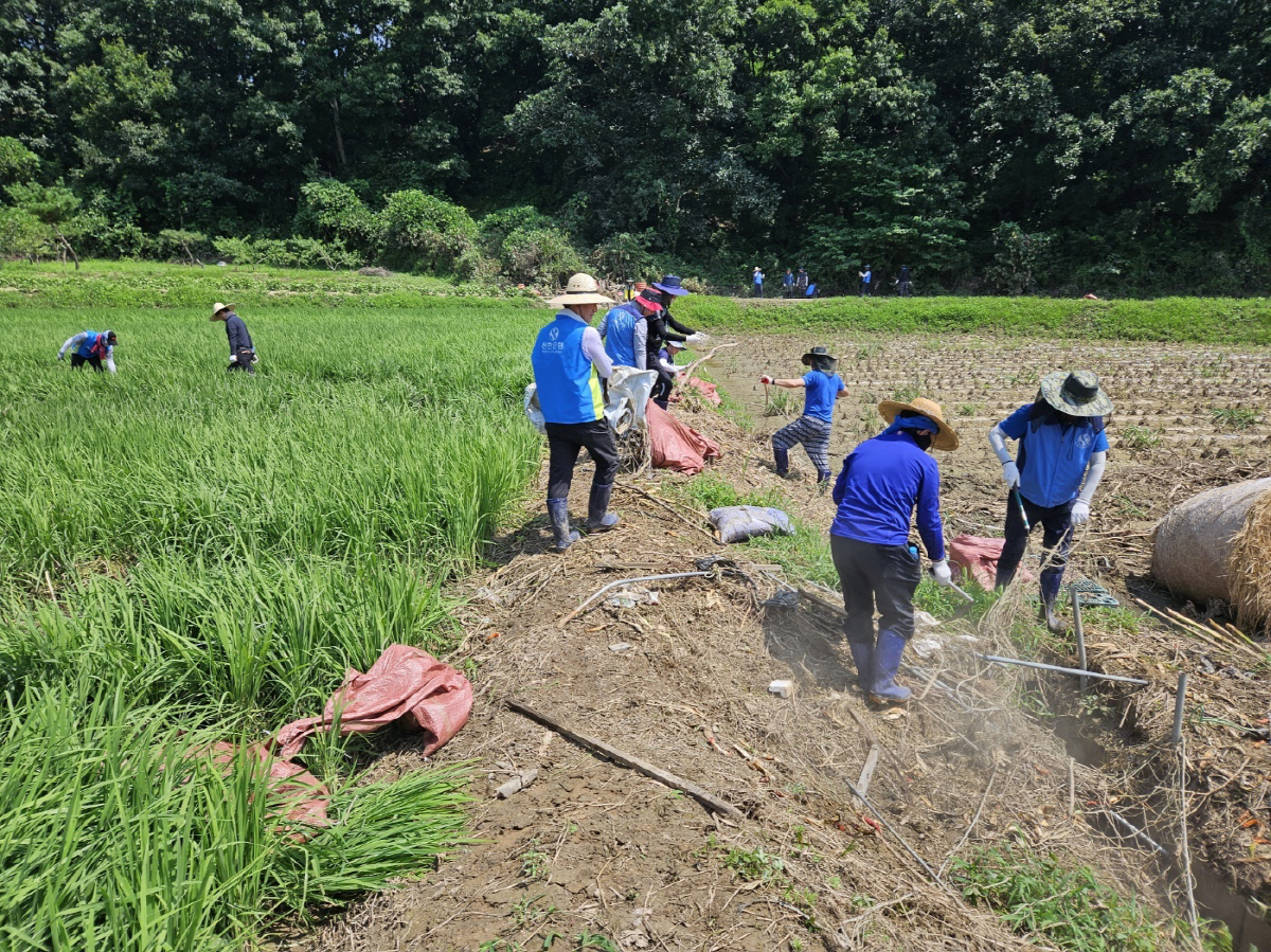 신한금융그룹 임직원들이 지난 29일 집중호우 피해를 입은 충청북도 충주시 단월동 일대에서 수해 복구를 위한 봉사활동을 펼쳤다.