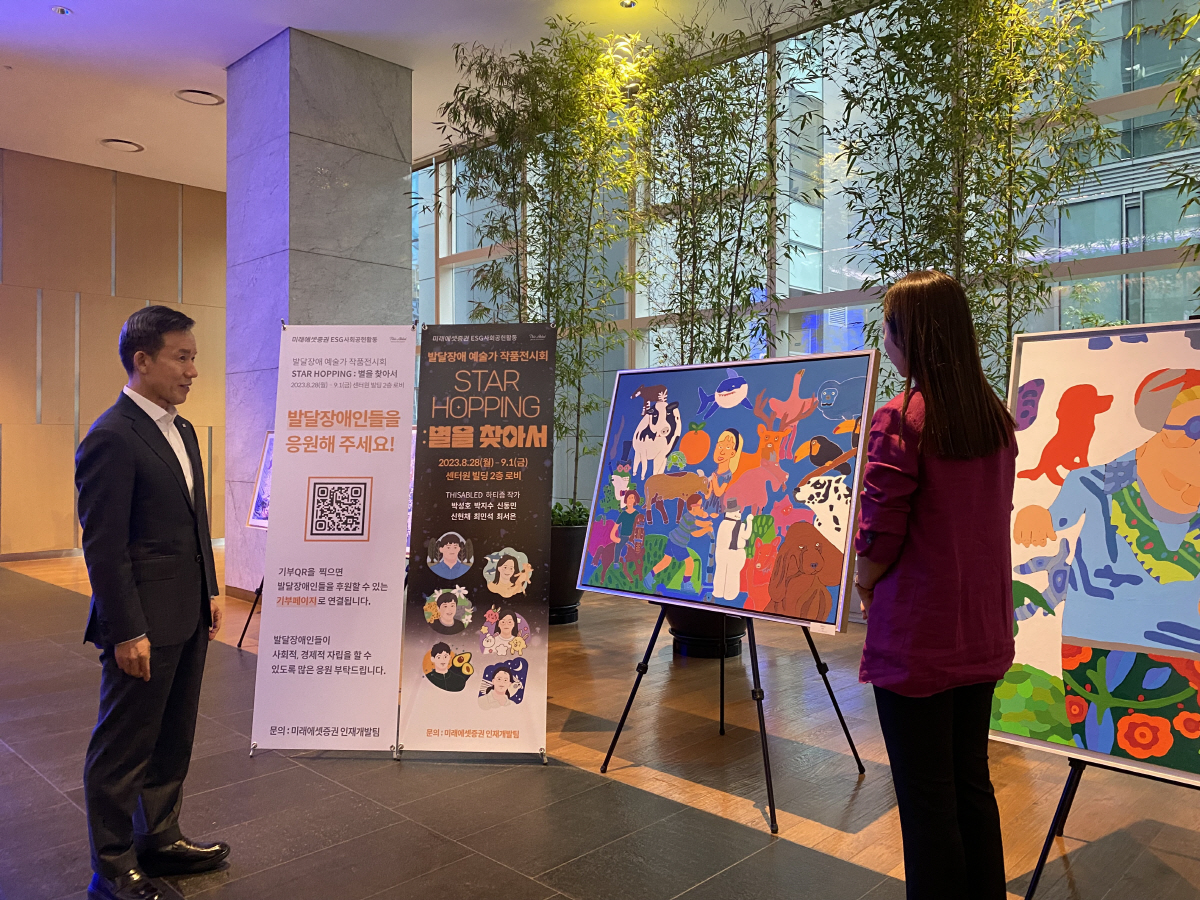 미래에셋증권은 오는 9월 1일까지 미래에셋 센터원 빌딩 2층 로비에서 '발달장애 예술가 작품 전시회'를 진행한다.