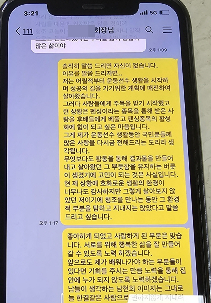 '솔직히 말씀드리면 (며느리 되는 게) 자신이 없습니다. 저는 어릴 적부터 운동선수 생활을 시작하며 성공의 길을 가기 위한 계획에 매진해 살아왔습니다. 그러다 사람들에게 주목받기 시작했고 현 상황은 펜싱이라는 종목을 통해 받은 사랑을 후배들에게 베풀고 펜싱 종목 활성화에 힘이 되고 싶은 마음입니다. 그게 제가 운동선수 생활 동안 국민들에게 받은 사랑을 다시금 전해드리는 도리라 생각합니다. 무엇보다 활동을 통해 결과물을 만들어내고 살아왔던 그 뿌듯함을 유지하는 버릇이 생겼기에 고민이 되는 것은 사실입니다. 현 제 상황에 호화로운 생활의 환경이 너무나도 감사하지만 그렇게 살아보지 않았던 저이기에 청조를 만나는 동안 그 환경적 부분을 탐하고 지내지는 않았다고 말씀드리고 싶습니다. 좋아하게 되었고 사랑하게 된 부분은 맞습니다. 서로를 위해 행복한 삶을 잘 만들어갈 수 있도록 노력하겠습니다. 앞으로도 제가 배워나가야 하는 부분이 있다면 기회를 주시는 만큼 노력을 통해 집안에 누가 되지 않도록 노력하겠습니다. 남들이 생각하는 남현희 이미지는 그대로 늘 한결같은 사람으로 변하지 않게 지내려 합니다. 행복하게 잘 살아갈 수 있도록 노력하겠습니다.'