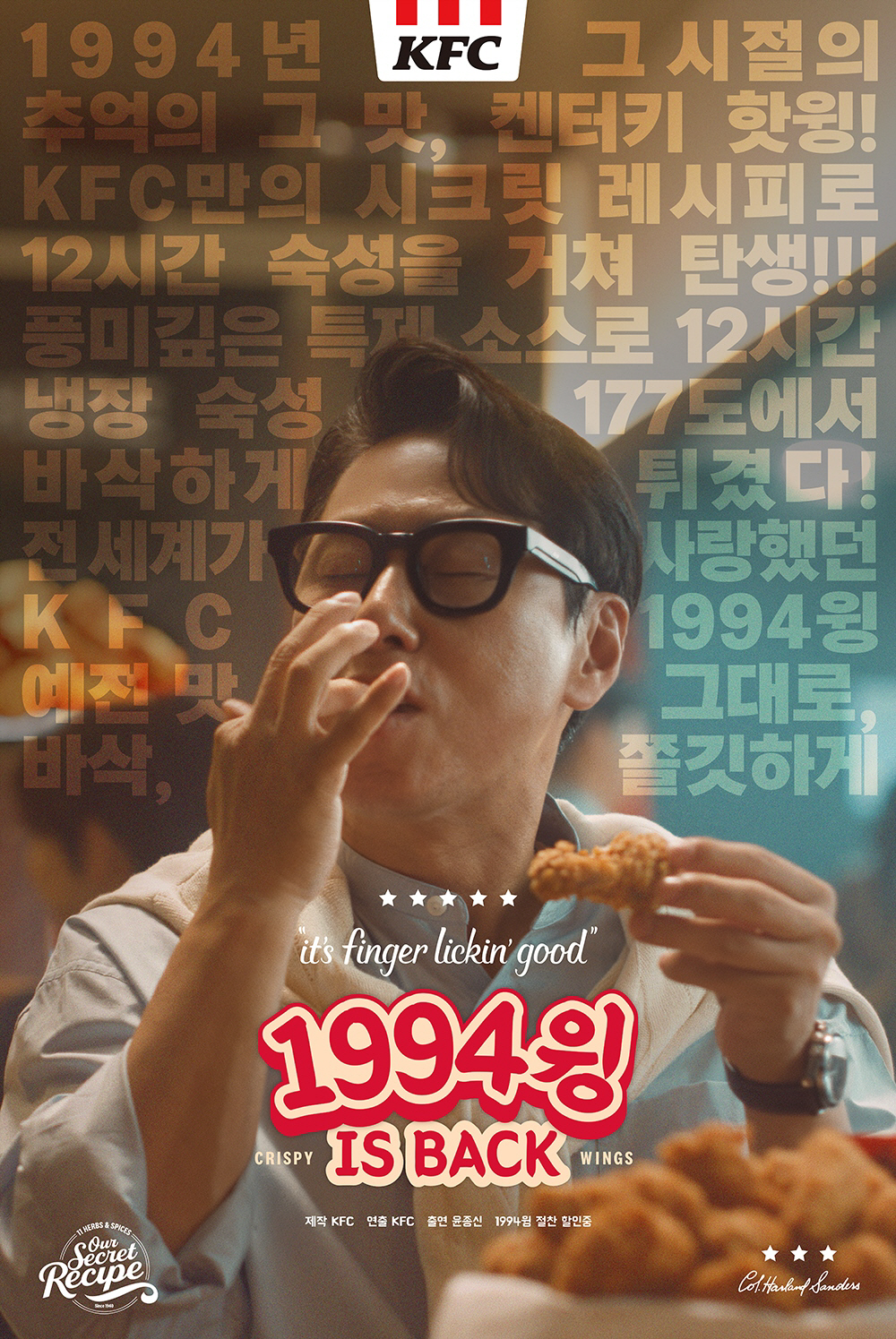 KFC가 가수 윤종신, 배우 김아영과 함께한 '1994 윙' 광고를 14일 공개했다. '1994 윙 IS BACK'을 콘셉트로 내세웠다.