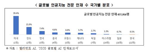 보고서는 AI 전문 연구기관인 엘리먼트 AI가 발표한 '2020 글로벌 AI 인재보고'를 인용해 한국이 보유한 AI 인재 수가 2천551명, 전 세계의 0.5%에 불과하다고 지적했다.
