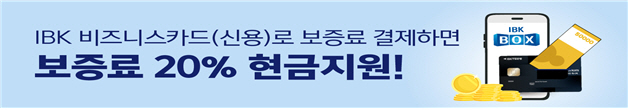 최근 6개월 이내 IBK 사업자 신용카드 결제 이력이 없는 고객이 보증료 지원 대상으로, IBK BOX를 통해 초저금리 특별대출(간편보증) 기간연장을 신청하고, IBK비즈니스카드(신용)로 보증료를 결제하면 보증료의 최대 20%(최대 5만원)를 지원한다. IBK비즈니스카드(신용)는 기업인터넷뱅킹 또는 기업스마트뱅킹에서 발급 가능하다.