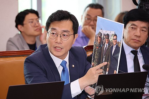 (서울=연합뉴스) 임형섭 오규진 기자 = 국회 법제사법위원회의 19일 '윤석열 대통령 탄핵소추안 발의 요청' 국민청원 청문회에서 더불어민주당이 이종호 전 블랙펄인베스트먼트 대표의 해병대 1사단 방문 사진을 공개하며 임성근 전 해병대 1사단장을 추궁했다.