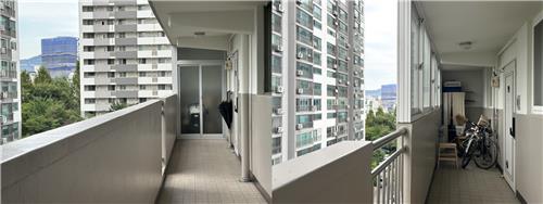 역시 지난달 29일 서울시 성동구의 또 다른 아파트(24층). 1996년에 준공된 복도식 구조다. 이곳도 복도에 개인 물건을 두고 생활하는 집이 많았다. 층마다 두 집에 한 집꼴로 분리수거함, 우산꽂이 등 각종 개인 물건을 복도에 내놓고 사용하고 있었다. 복도에 창틀과 가림막을 설치한 집도 있었다. 바깥에 노출된 복도를 통해 비나 눈, 바람 등의 영향을 직접 받아 생활에 불편이 있다는 이유에서다. 문을 설치해 복도를 창고로 만든 집도 있었다. 여기도 완강기가 없기는 마찬가지였다.