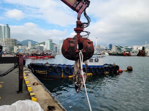 (부산=연합뉴스) 손형주 기자 = 부산해양경찰서는 지난 15일 오후 2시 30분께 부산 자갈치 크루즈 선착장 앞 해상에서 신고를 받고 출동한 연안 구조정이 상어 사체를 인양했다고 16일 밝혔다.