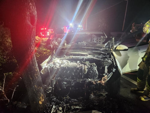 (제주=연합뉴스) 전지혜 기자 = 4일 0시 6분께 제주시 조천읍의 한 도로에서 가로수를 들이받은 아이오닉 전기차에 불이 났다.
