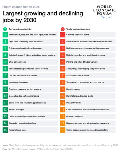 이런 점을 고려할 때 생성형 AI 및 재생에너지 관련 시장이 고용에 큰 변화를 일으키면서 이 분야의 전문직 수요가 크게 증가하는 반면 단순 행정 및 계산 작업, 그래픽 디자이너 등의 직무는 고용이 감소할 것으로 예상됐다.