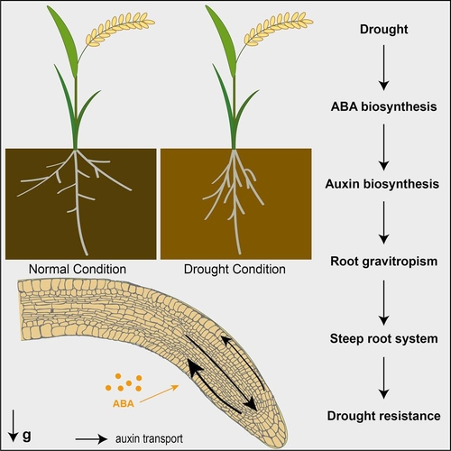 그 결과 ABA가 식물 성장 호르몬의 하나인 옥신(auxin) 생성을 촉진해 가뭄에 대응해 뿌리가 중력을 향해 더 가파르게 자라게 하는 뿌리 중력 굴성(root gravitropism)을 강화하는 것으로 밝혀졌다.