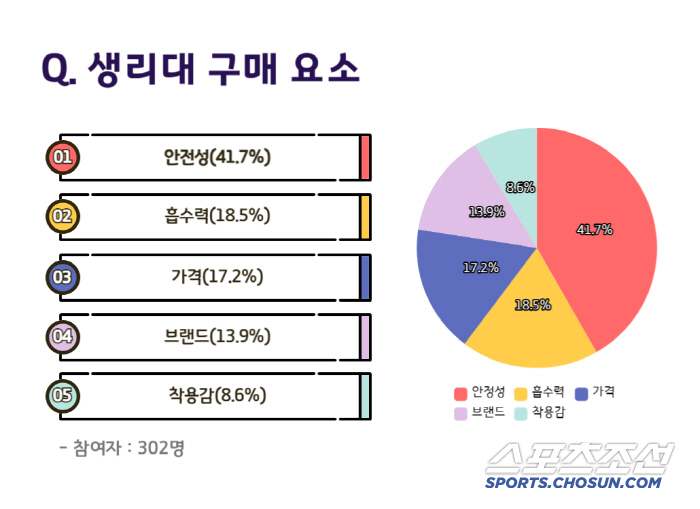 조사 결과 생리대 구매 시 가장 중요하게 생각하는 요소로 '안전성'이 41.7%로 가장 높게 나타났다. 이어 '흡수력'(18.5%), '가격'(17.2%) 브랜드(13.9%), 착용감(8.6%) 순으로 나타났다. 이로써 가격이나 브랜드보다 안전성을 최우선시 하는 경향이 두드러지게 나타났다.