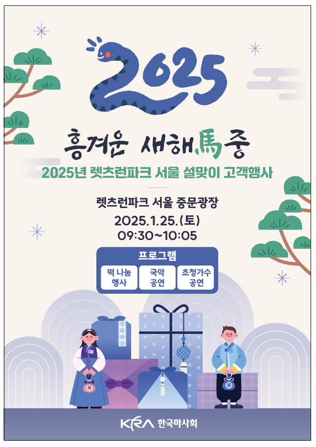 마사회는 오는 25일 렛츠런파크 서울 중문 광장에서 설맞이 '흥겨운 새해마중' 행사를 개최한다. 이번 행사는 기존 1월 첫째 주에 예정되어 있었으나, 국가애도기간으로 인해 이번 설 명절로 순연되었다.