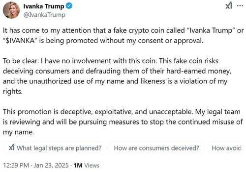 이방카의 이름을 딴 가짜 코인이 등장한 것은 최근 트럼프 대통령과 영부인 멜라니아 여사가 각각 자신의 이름을 딴 밈 코인을 실제 발행한 이후 벌어진 일이라고 미 언론은 짚었다.