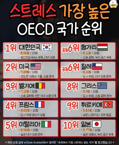 최근 온라인커뮤니티에는 "경제협력개발기구(OECD) 국가 중 스트레스가 가장 높은 나라로 한국이 1위를 기록했다"는 게시물이 주목받았다.
