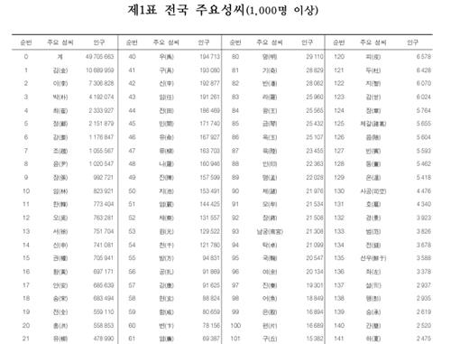 '김·이·박'씨 거의 절반…전체 성씨 5천500개 넘어