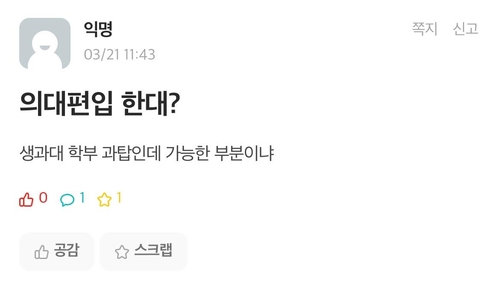 고려대 온라인 커뮤니티에는 "생명대 과탑인데 의대 편입 가능한가요?", "의대 편입하려면 어떤 걸 준비해야 하나요?" 등을 묻는 게시글이 공유됐다.