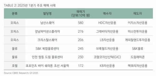 최수혜 CBRE 코리아 리서치 총괄 상무는 "1분기 상업용 부동산 시장은 오피스 선매입과 물류 자산에 대한 글로벌 투자자 유입으로 견조한 흐름을 이어갔으며 앞으로도 외국계 투자자 중심으로 투자 수요가 높게 나타날 것으로 보인다"고 말했다.