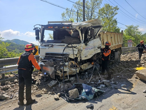 사고 충격으로 25t 덤프트럭이 전도되면서 적재함에 실린 돌이 도로 위로 쏟아졌다.