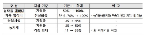 또 비닐하우스와 과수 재배 시설, 축사 등 농업시설에 대한 보조율을 35%에서 45%로 높였다.