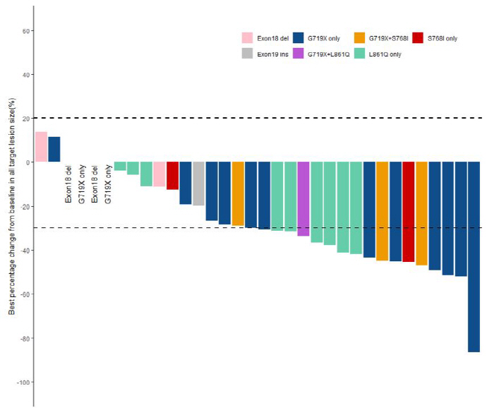 변이 유형별 종양 감소 비율. 가장 많은 감소를 보인 환자 변이는 G719X 단일 변이였다.