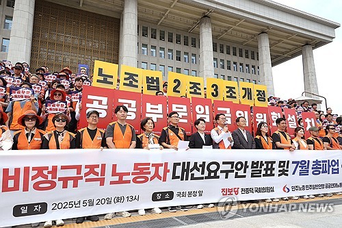 (서울=연합뉴스) 김은경 기자 = 근로자들이 6·3 대선 후보들이 가장 먼저 추진해야 할 노동정책으로 '비정규직 고용불안 문제 해결'을 꼽았다는 조사 결과가 나왔다.