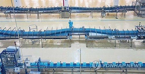 견학로 양쪽으로 길게 늘어선 컨베이어 벨트에는 하늘색 뚜껑을 달고 같은 색 라벨을 두른 백산수 제품이 빼곡히 실려 물류 창고로 빠르게 들어가고 있었다.