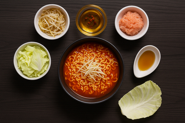 얇게 썬 양배추는 달콤한 맛과 아삭한 식감으로 라면의 포만감을 높인다. 국물 라면에 넣으면 느끼함을 줄이고, 비빔라면에는 씹는 재미를 더한다. 끓는 국물에 1~2분만 넣어 살짝 익히면 단맛이 배어나온다. 당근이나 파프리카와 함께 넣으면 색감과 영양이 더욱 풍부해진다.