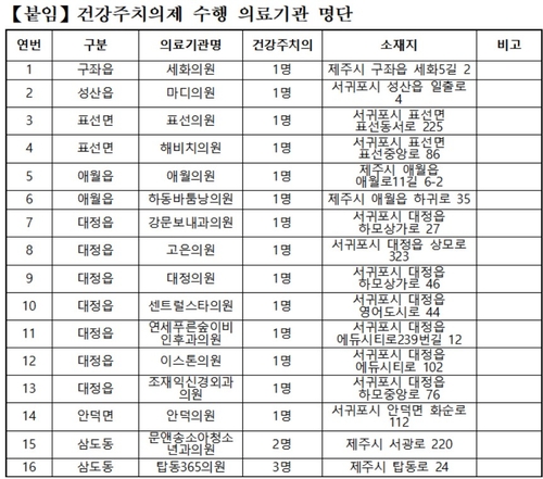 이번에 선정된 의료기관은 구좌읍, 성산읍, 표선면, 애월읍, 대정읍, 안덕면, 삼도동 등 7개 시범지역 내 의원 16곳이며 이곳에서 근무하는 의사 19명이 건강주치의로 지정됐다.