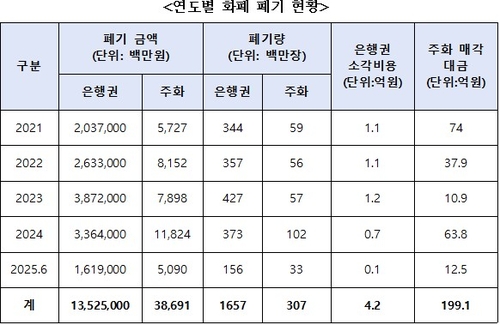 3일 한은이 국회 기획재정위원회 소속 국민의힘 박성훈 의원에게 제출한 자료에 따르면, 한은은 2021년부터 올해 6월까지 총 19억6천400만장의 화폐를 폐기했다.