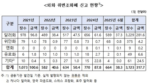5일 한국은행이 국회 기획재정위원회 소속 국민의힘 박성훈 의원에게 제출한 자료에 따르면, 2021년부터 올해 6월까지 국내 은행권에서 신고된 외화 위·변조 화폐는 총 3천723장으로 집계됐다.