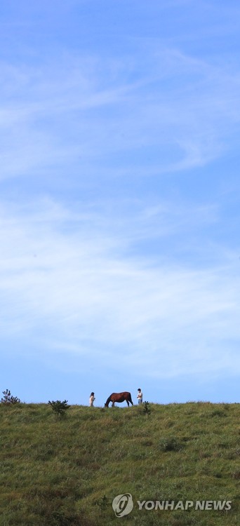 제주시 애월읍 새별오름은 오름 전체가 춤을 추듯 나풀거리는 억새에 더해 높아진 가을 하늘을 감상하기 좋다. 구름 한 점 없는 새파란 하늘 아래 홀로 솟은 새별오름은 '가을' 그 자체다.