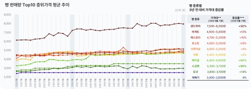 샌드위치(7천500원∼8천300원·32%)와 소금빵(3천300원∼3천700원·30%)도 30%대 증가율을 기록했다.