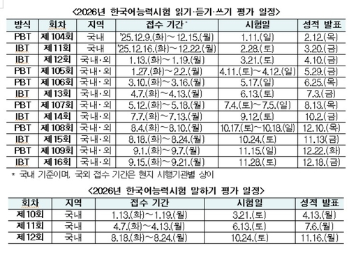 내년 한국어능력시험 읽기·듣기·쓰기 평가(TOPIK I·Ⅱ)는 지필시험(PBT) 6회, 인터넷 기반 시험 6회로 총 12회 시행된다. 말하기 평가는 인터넷 기반 시험으로 3회 실시된다.