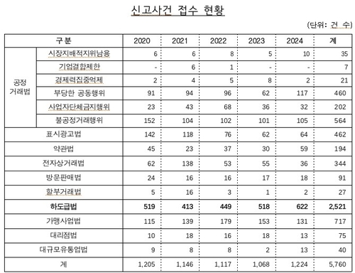 13일 국회 정무위원회 국민의힘 이양수 의원실이 공정위로부터 받은 자료를 보면, 2020∼2024년 하도급법 위반 신고는 2천521건으로 집계됐다.