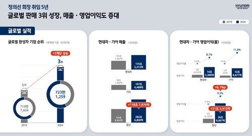 현대차·기아의 합산 매출도 2019년 163조9천억원에서 2024년 282조7천억원으로 73% 늘었고, 같은 기간 합산 영업이익은 5조6천억원에서 26조9천억원으로 380% 급증했다.