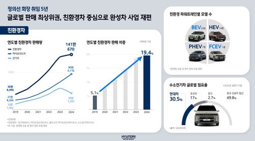 이에 따라 지난해 친환경차 판매량은 5년 전 대비 4배가량 증가한 141만여대를 기록했고, 전체 판매에서 친환경차가 차지하는 비중도 19.4%로 커졌다.