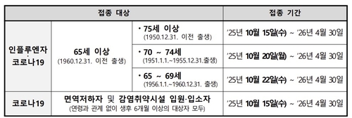 질병관리청은 15일부터 내년 4월 30일까지 어르신과 코로나19 위험군을 대상으로 2025∼2026절기 인플루엔자 예방접종과 코로나19 예방접종을 실시한다고 14일 밝혔다.