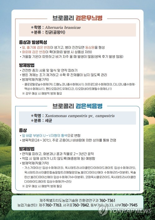 브로콜리 주요 병해의 진단과 방제 정보는 제주도 농업기술원 누리집(https://agri.jeju.go.kr/agri/index.htm)에서 찾아볼 수 있다.
