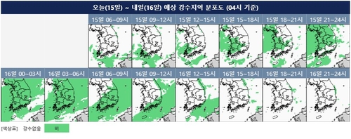 15∼16일 예상 강수량은 강원영동·광주·전남·부산·울산·경남·경북중부·경북북부 20∼60㎜, 제주 10∼60㎜, 서해5도·충청·전북 10∼50㎜, 수도권·강원영서·대구·경북남부·울릉도·독도 10∼40㎜이다.