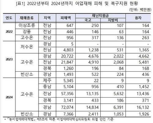이 중 전남이 266억원(저수온·고수온), 경남이 222억원(저수온·고수온·빈산소)으로 집계돼 어업피해 대부분을 차지했다.