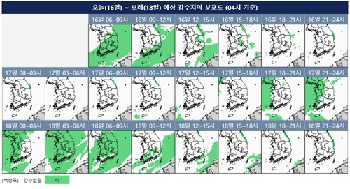 (서울=연합뉴스) 이재영 기자 = 16일 동해안과 제주를 중심으로 비가 이어지겠다.