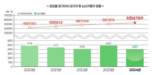 복지부에 따르면 국내 장기 기증은 뇌사에만 전적으로 의존하고 있는데, 뇌사 장기 기증자는 2020년 478명에서 지난해 397명으로 줄고 장기 이식 대기자는 4만3천182명에서 5만4천789명으로 늘었다.
