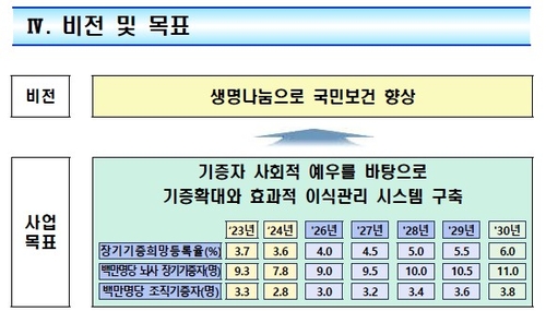 정부는 이번 계획을 통해 장기 기증 희망 등록률을 작년 3.6%에서 2030년 6.0%로 올리고, 같은 기간 100만명당 뇌사 장기 기증자는 7.8명에서 11.0명, 조직 기증자는 2.8명에서 3.8명으로 늘린다는 방침이다.