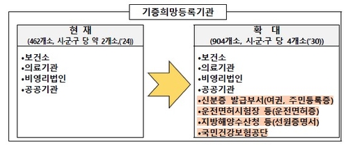 기존의 보건소, 의료기관 등에 더해 신분증을 발급하는 주민센터, 도로교통공단 등을 등록 기관으로 지정한다.