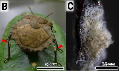 연구팀은 수십년간 '고막기관'(tympanal organ)으로 알려져 있던 디니도리드과 악취노린재(dinidorid stinkbug) 암컷의 뒷다리 구조물 기능을 연구하는 과정에서 이 구조물이 곤충과 곰팡이의 공생 기관이라는 사실을 발견했다고 설명했다.