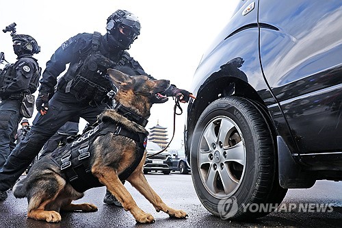 경찰 특공대원들이 주변을 경계하는 동안 탐지견이 동원돼 탐지작업을 벌였다.