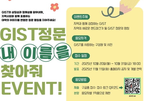 정용화 지스트 대외부총장은 21일 "명칭 공모는 정문에 생명을 불어넣는 뜻깊은 과정"이라며 "지난 30여년간 지역과 함께 성장해 온 연구중심대학으로서, 지스트의 정신과 비전을 국민과 함께 공유하는 계기가 되길 바란다"고 말했다.