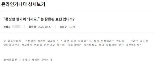 오 교수는 "그런 맥락에서 '즐거운 한가위 되세요'도 충분히 쓸 수 있는 표현"이라며 "언어는 유연하게 바라볼 필요가 있다"고 덧붙였다.