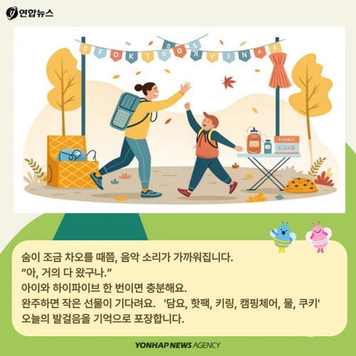 숨이 조금 차오를 때쯤, 음악 소리가 가까워집니다. "아, 거의 다 왔구나." 아이와 하이 파이브 한 번이면 충분해요.
